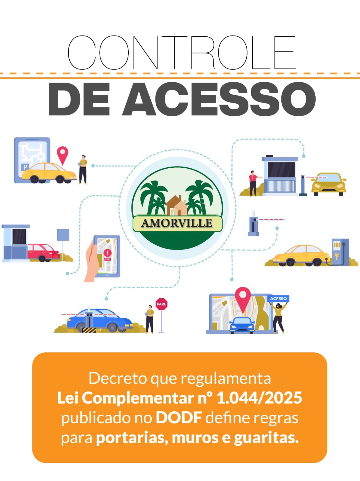 A norma estabelece regras para muros, guaritas e portarias em condomínios, incluindo exigência de licenciamento, apresentação de projeto urbanístico, limite de até 30 m² para guaritas e garantia de circulação em áreas públicas. A fiscalização será realizada pelo DF Legal.